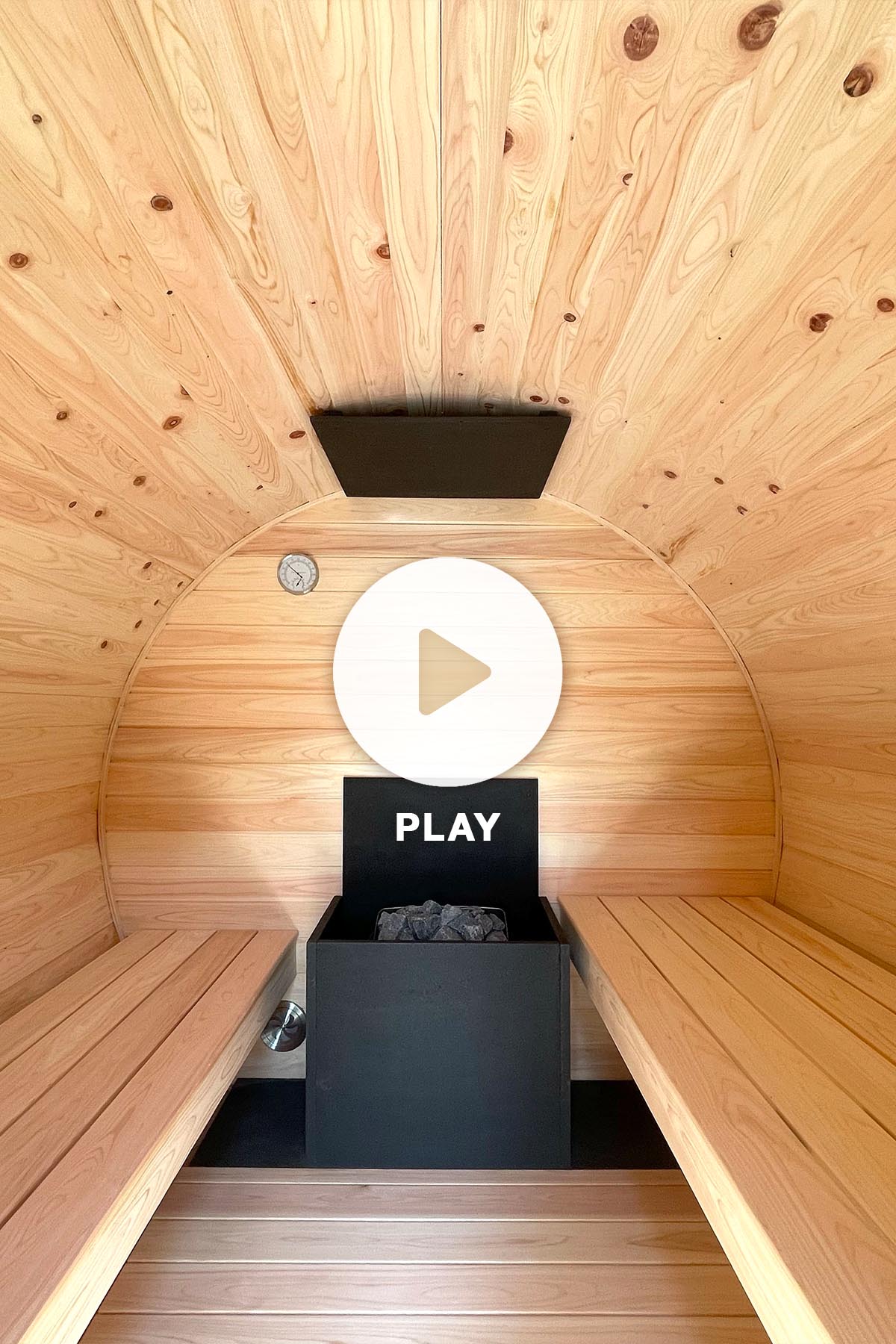 室内は体感温度を変えて楽しめる、左右段違いベンチを採用。窓なしのモデルは、背面からのプライバシーを守り、よりサウナに集中することができます。入り口の窓から前方の景色を楽しむことができますので、プライベートな空間を保ちつつ外部の様子を確認することが可能です。アスファルトシングル屋根などを使わず、総ヒノキ造りのバレルサウナ外部をサーモウッドで覆ったバロウは、ウッドデッキやフェンス、木造建築との相性もよく、他のバレルサウナにはない耐久性で、長期導入を検討している施設やご家庭におすすめです。