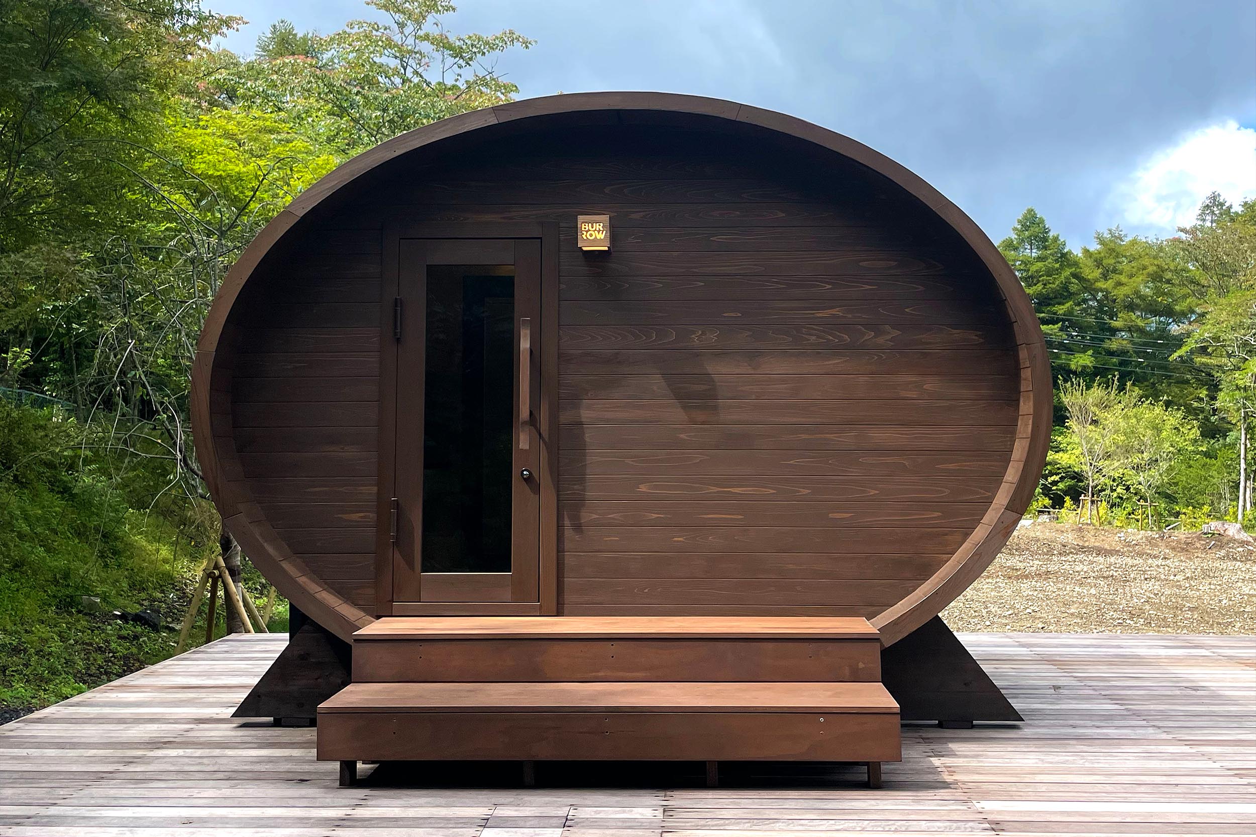 山梨県山中湖にある別荘で『BURROW OVAL SAUNA』のブラウン系が導入されました。通常のバレルサウナ同様、屋根部にビニールシートやアスファルト屋根などを使わず、木材のみで強度や耐久性を高めたBURROWは、ウッドデッキや自然環境との相性も抜群、購入後の雨漏りなどの心配も不要です。