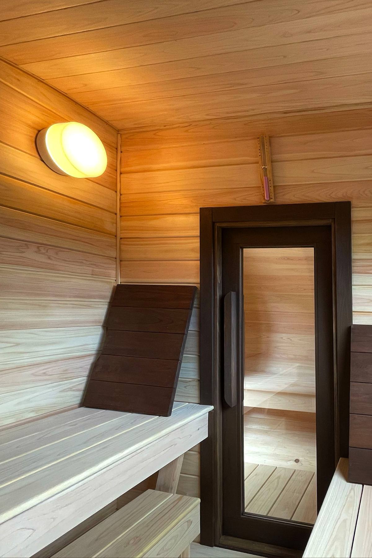 こちらのオーバルサウナは、BURROWオリジナル電気ヒーター6kwを搭載。体感温度を変えて楽しめる左右段違いベンチにヒノキのステップ付き。背面に特注の長方形窓を設置、窓目隠し兼用の背もたれ付きになります。高いベンチに腰掛け、四季折々、自然が織りなす景色を楽しみながら日々のサウナタイムをより充実したものにします。窓目隠しはプライベートな空間で、より深くサウナに集中したい時にもおすすめです。